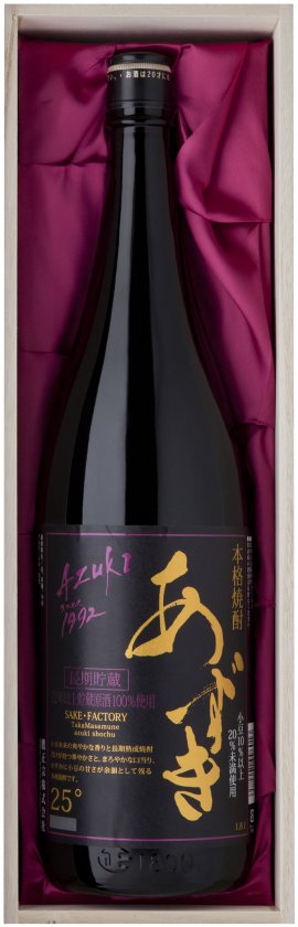 長期貯蔵22年以上貯蔵原酒100%使用した本格焼酎で、小豆本来の爽やかな香りと長期熟成焼酎だけが持つ華やかさと、まろやかな口あたり、かすかに小豆の甘さが余韻として残る本格焼酎です。